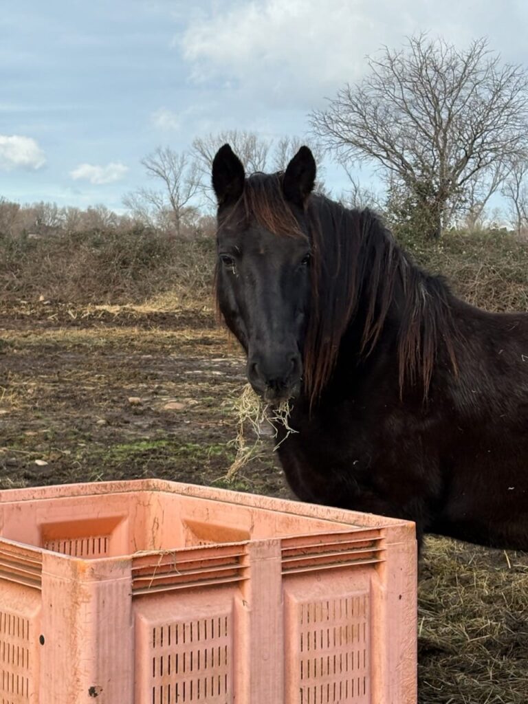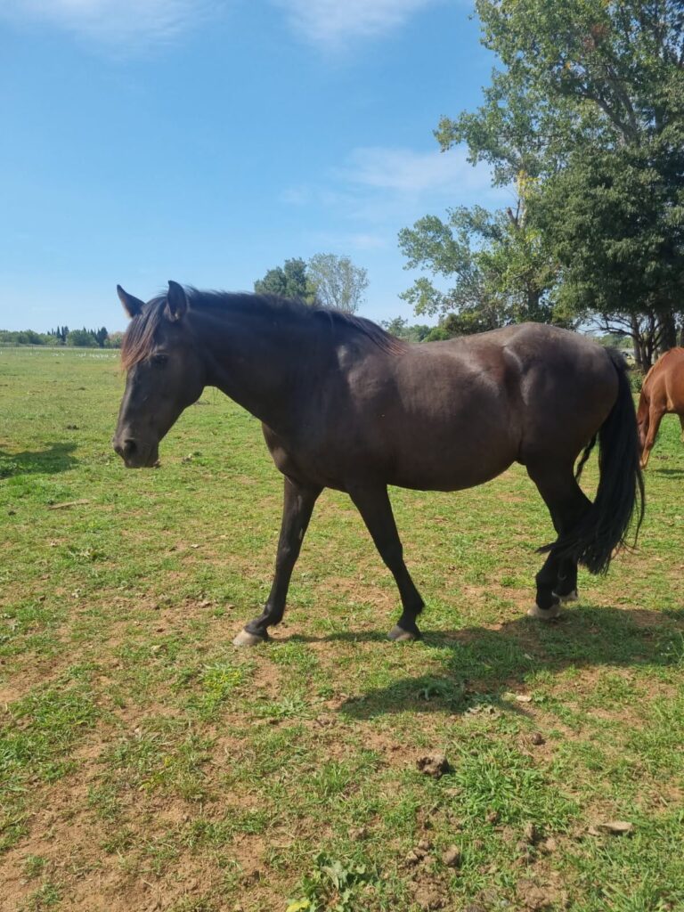 Hermès est noir, cheval joueur et attachant, il est prit d’un amour pour Shangil et reste tout les jours avec elle.